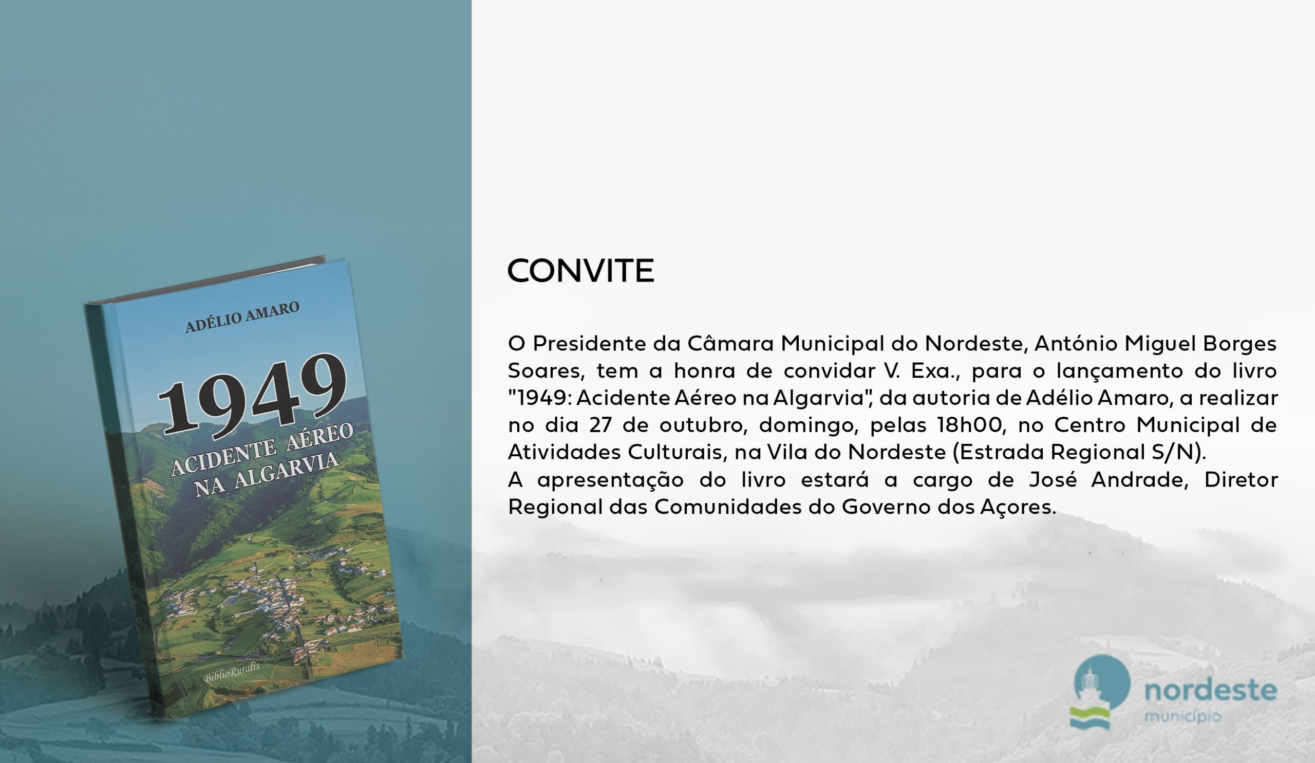 O investigador e escritor leiriense Adélio Amaro apresenta o seu novo livro “1949 – Acidente Aéreo na Algarvia” no próximo dia no dia 27 de outubro, domingo, pelas 18 horas, no Centro Municipal de Atividades Culturais, na Vila do Nordeste, na ilha de São Miguel, Açores. A entrada é livre.
