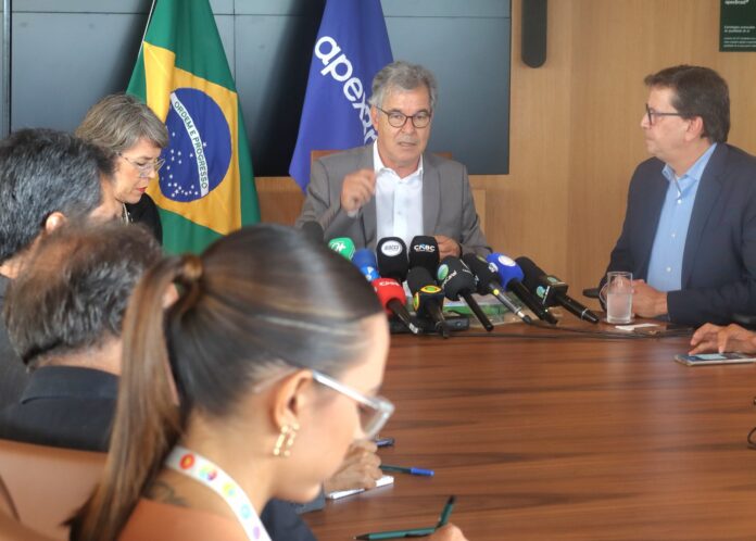 Jorge Viana, presidente da ApexBrasil, durante coletiva de imprensa em Brasília sobre o acordo Mercosul–União Europeia. Foto: divulgação/ApexBrasil