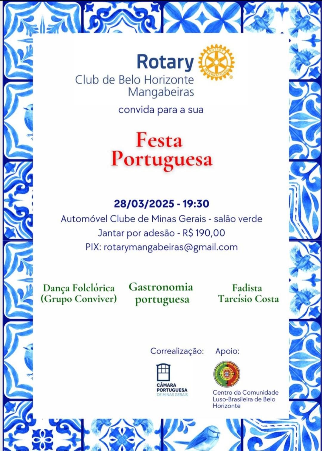 Uma “Festa Portuguesa” especial em Minas Gerais terá lugar no próximo dia 28 de março, pelas 20h, no Salão Verde do Automóvel Clube de Belo Horizonte. O evento tem caráter beneficente e é organizado pelo Rotary Club de Belo Horizonte Mangabeiras em parceria com a Câmara Portuguesa de Comércio no Brasil de Minas Gerais.