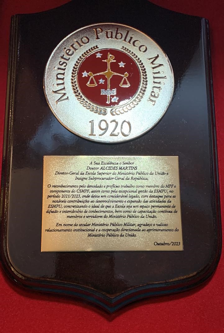 O subprocurador-Geral da República do Brasil e diretor-geral da Escola Superior do Ministério Público da União (ESMPU), Alcides Martins, recebeu uma homenagem do Ministério Público Militar, em outubro do ano passado, em virtude do “reconhecimento pelo seu trabalho como membro do Ministério Público Federal, e em virtude da sua gestão à frente do ESMPU”.