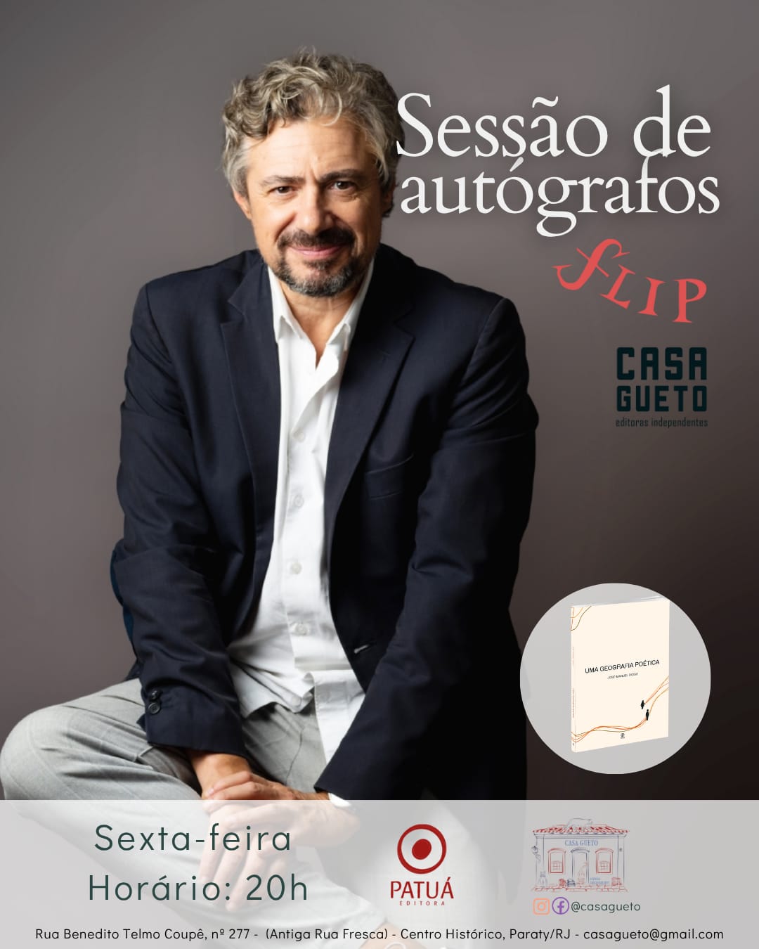 A sessão de autógrafos de José Manuel Diogo acontece na Rua Benedito Telmo Coupé, nº 277, antiga Rua Fresca, no coração de Paraty.