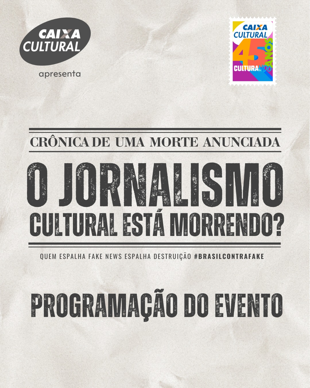 A CAIXA Cultural São Paulo apresenta, nos dias 14 e 15 de agosto, o ciclo de debates “Crónica de Uma Morte Anunciada: O Jornalismo Cultural Está Morrendo?”, reunindo alguns dos mais relevantes nomes do jornalismo cultural brasileiro para refletir sobre os “desafios, tensões e possibilidades” desse campo em transformação. O evento, gratuito e aberto ao público, acontece das 10h às 13h, na sede da Caixa Cultural, localizada na Praça da Sé, 111, no bairro do Centro.