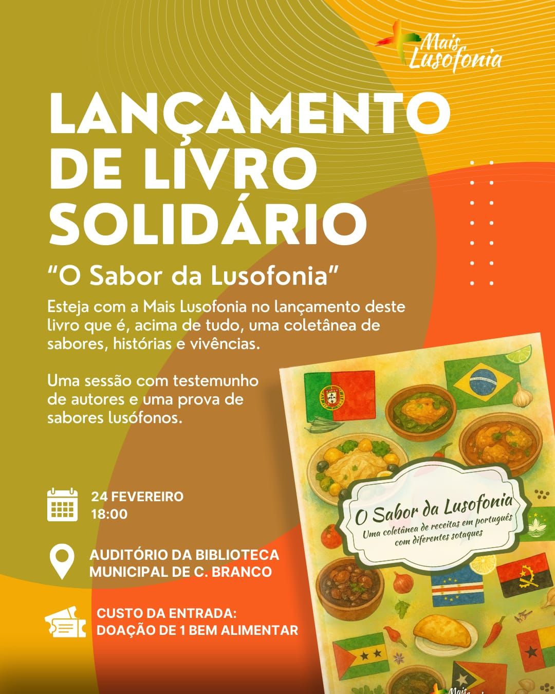 No próximo dia 24 de fevereiro, a Associação Mais Lusofonia, com sede em Castelo Branco, vai apresentar o livro solidário “O Sabor da Lusofonia”, uma coletânea de receitas e testemunhos que refletem a diversidade cultural dos países de língua portuguesa, num evento aberto ao público e de caráter solidário. A iniciativa assume igualmente uma dimensão solidária, sendo a entrada feita através da doação de um bem alimentar não perecível, que será posteriormente encaminhado para apoio social.