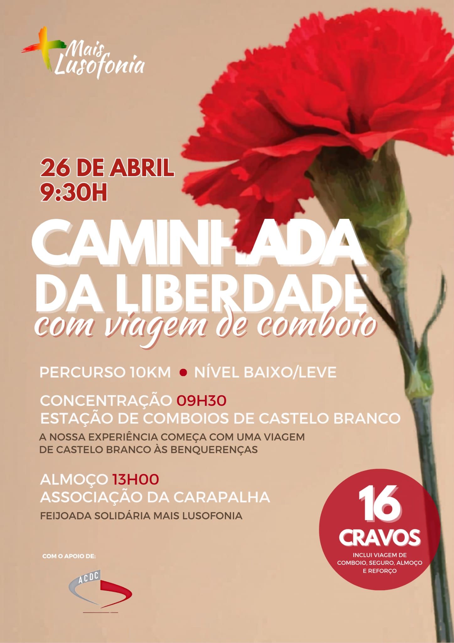 A tradicional “Caminhada da Liberdade”, promovida pela associação “Mais Lusofonia”, realiza-se no próximo dia 26 de abril, com concentração às 09h30 na estação de comboios de Castelo Branco, região Centro de Portugal, combinando um percurso pedestre de dez quilómetros com uma viagem até Benquerenças e um almoço solidário no final da iniciativa.