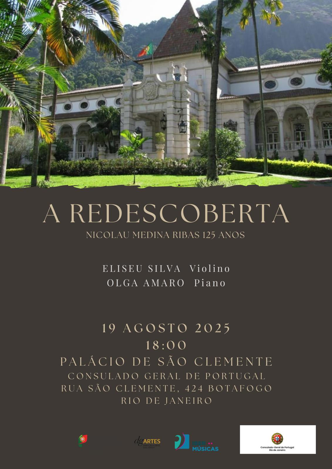 O Consulado-Geral de Portugal no Rio de Janeiro, Brasil, vai receber, no dia 19 de agosto, pelas 18h, o recital “A Redescoberta”, no âmbito das comemorações dos 125 anos do nascimento do compositor Nicolau Medina Ribas. O evento, com entrada gratuita, terá lugar no Palácio de São Clemente, sede da representação diplomática portuguesa na cidade.