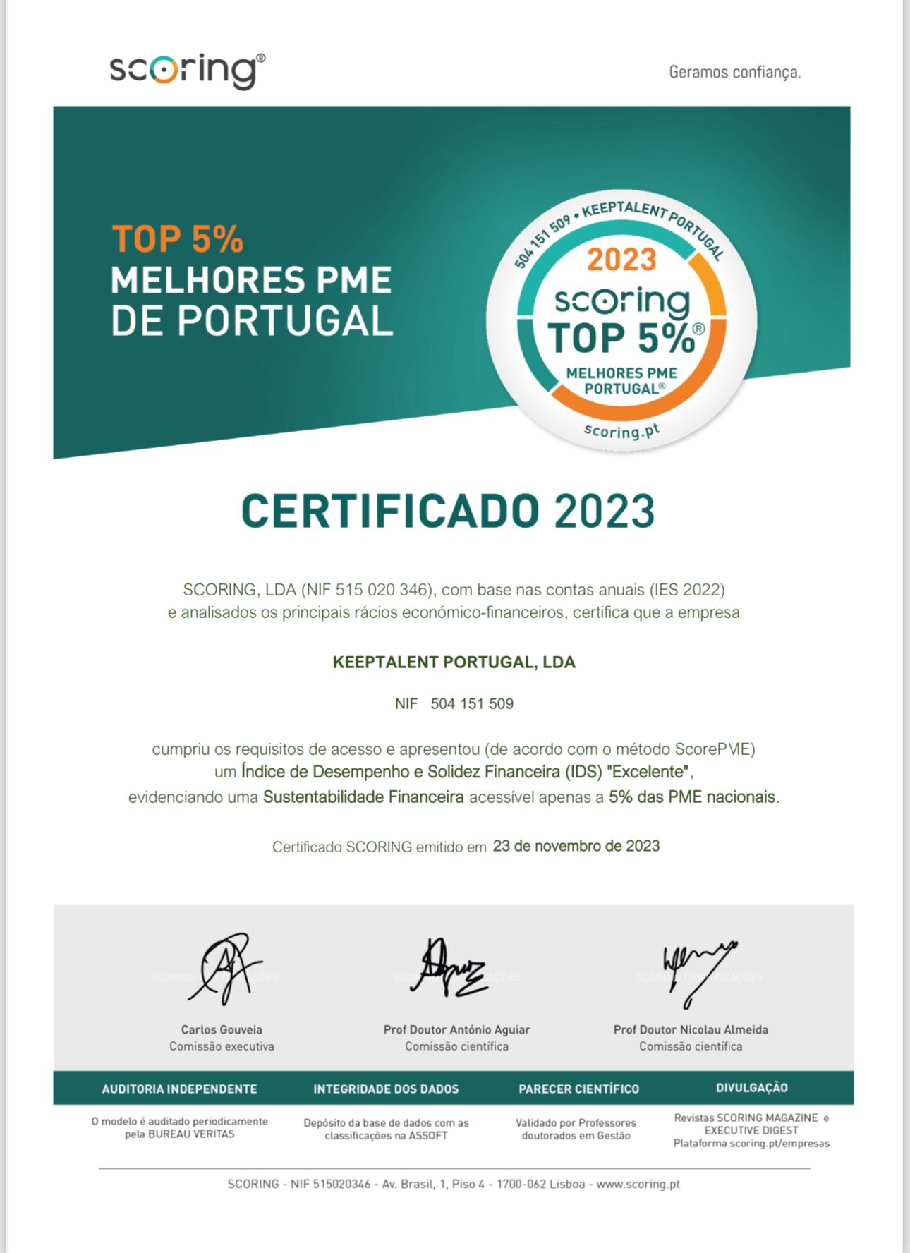 A Keeptalent Portugal foi enquadrada na lista das 5% melhores PME de Portugal 2023 pela SCORING, entidade de certificação financeira de empresas. Segundo apurámos, esta marca foi alcançada pela Keeptalent Portugal em virtude do índice de desempenho e solidez financeira nível “Excelente”, o que revela “sustentabilidade financeira” desta organização.