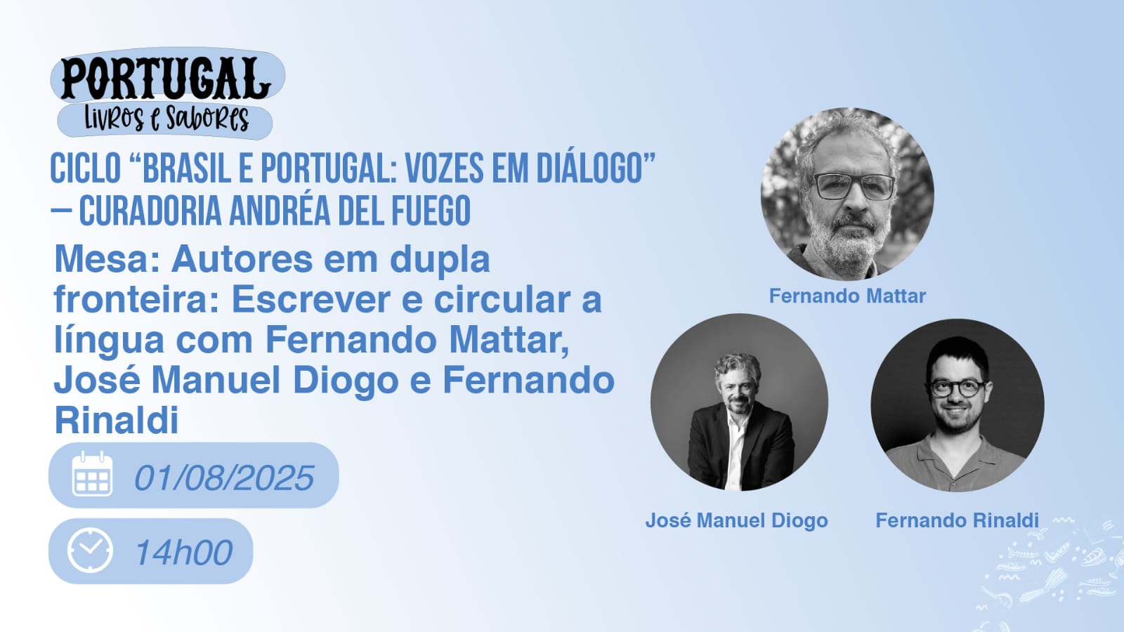 O encontro integra o programa “Portugal – Livros e Sabores” e contará com a participação dos autores Fernando Mattar, José Manuel Diogo e Fernando Rinaldi, figuras com trajetórias literárias que atravessam os dois lados do Atlântico. O debate pretende explorar os caminhos contemporâneos da literatura produzida em português por autores que vivem e escrevem entre fronteiras culturais e geográficas.