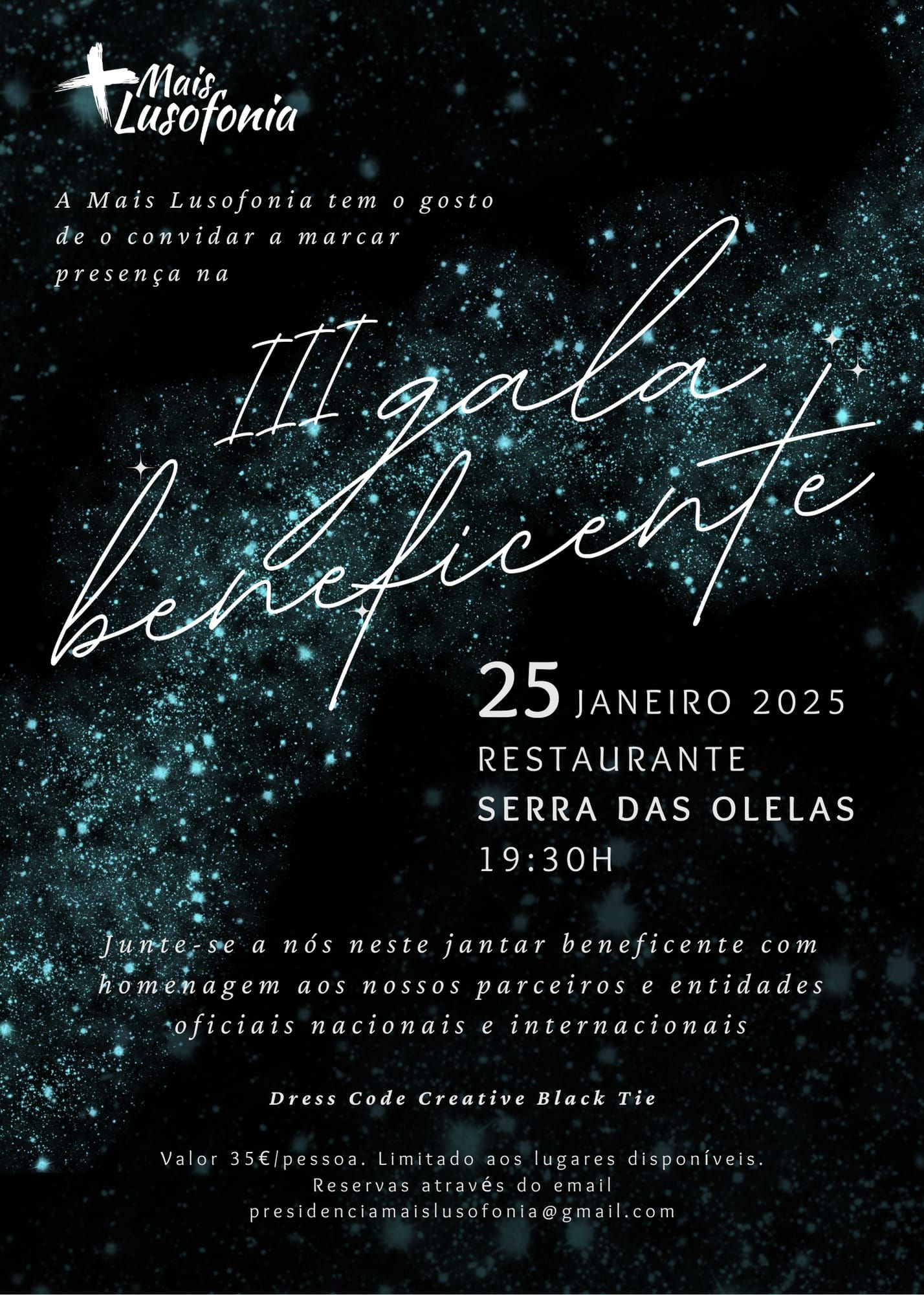 A Associação Mais Lusofonia, com sede em Castelo Branco, Portugal, vai promover a III Gala Beneficente no próximo dia 25 de janeiro de 2025, no Restaurante Quinta das Olelas, localizado na Serra das Olelas, às 19h30. O evento é uma “celebração da solidariedade e união entre as comunidades lusófonas”, com uma homenagem especial a parceiros e entidades que têm contribuído significativamente para o trabalho da associação.