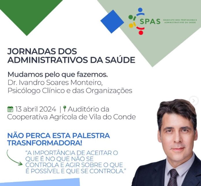 O psicólogo clínico e professor universitário português Ivandro Soares Monteiro vai realizar mais uma palestra do Tour “Mudamos pelo que Fazemos” 2024 no próximo dia 13 de abril, sábado de tarde, em Vila do Conde, a convite do Sindicato dos Profissionais Administrativos da Saúde, no âmbito das Jornadas dos Administrativos da Saúde.