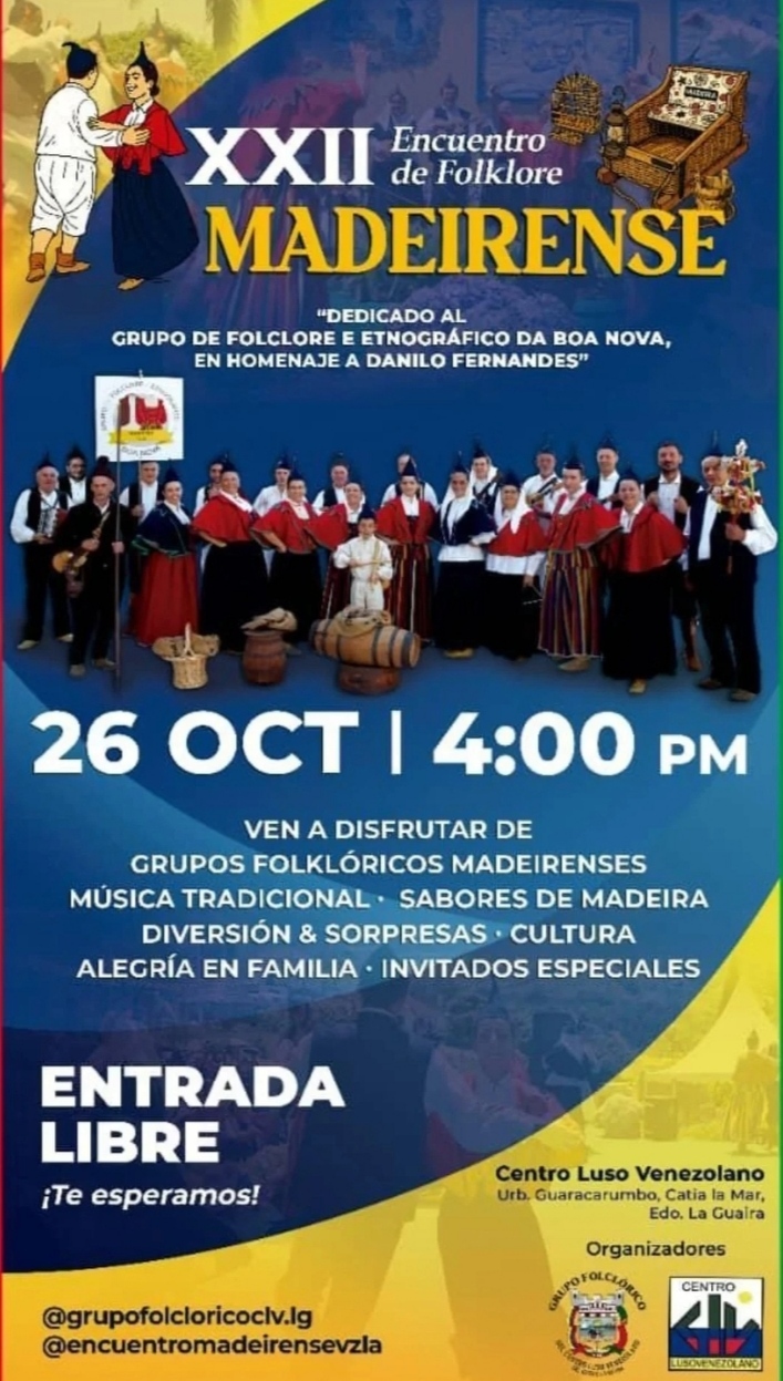 No domingo, 26 de outubro do presente ano de 2025, será realizada nas instalações do Centro Social Luso Venezolano, localizado em Catia La Mar, município de Vargas, estado de La Guaira, a 31,7 km ao norte de Caracas, a vigésima segunda edição do Encontro Folclórico Madeirense, com o lema “Dedicado ao Grupo de Folclore e Etnográfico de Boa Nova”, em homenagem ao exemplo e esforço que este grupo cultural tem mantido trabalho de investigação em prol da recuperação de trajes, músicas e costumes da Ilha da Madeira.