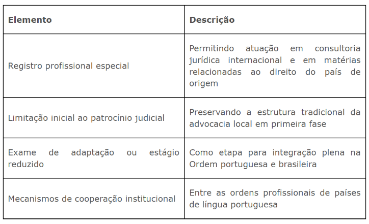 Esse modelo permitiria compatibilizar três objetivos fundamentais: (i) Preservar a autonomia regulatória da Ordem portuguesa; (ii) Evitar discriminações incompatíveis com compromissos internacionais; e, (iii) Manter a mobilidade profissional dentro do espaço jurídico lusófono.