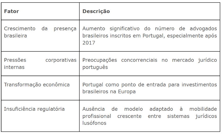 A motivação da deliberação de encerramento do regime de reciprocidade pelo Conselho Geral da Ordem dos Advogados portuguesa, foi sob o argumento de que o modelo vigente não asseguraria níveis equivalentes de qualificação profissional e poderia estar sendo utilizado de forma indevida como mecanismo de acesso indireto ao mercado jurídico europeu.