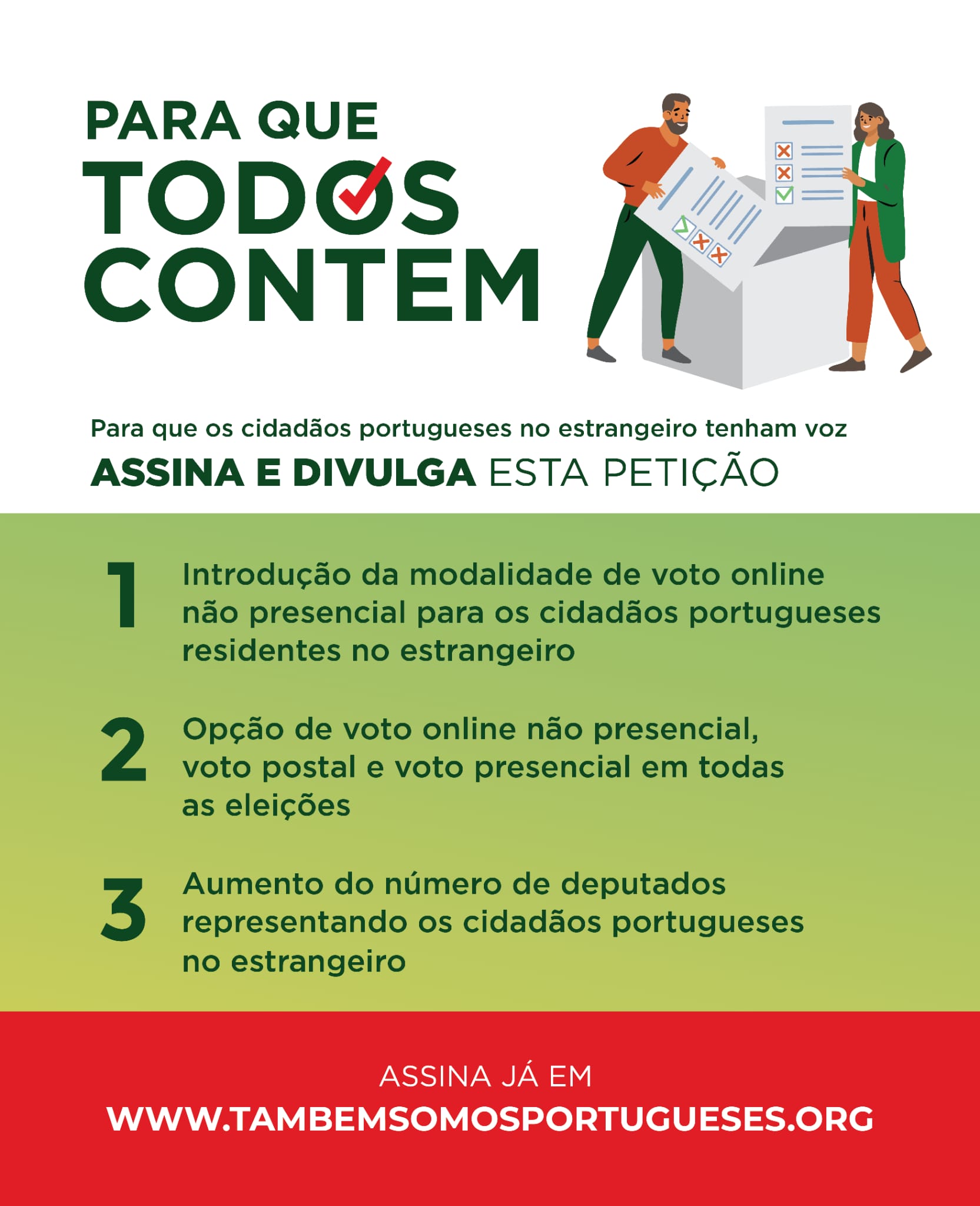 A Associação Também Somos Portugueses (TSP) lançou uma petição pública, em conjunto com o Grupo de Reflexão e Intervenção – Diáspora Portuguesa na Alemanha (GRI-DPA) e o Movimento Sinergias da Diáspora, que visa angariar assinaturas que possibilitarão a discussão pública dos seguintes temas na Assembleia da República portuguesa: introdução da modalidade de voto on-line não presencial para os cidadãos portugueses residentes no estrangeiro; opção de voto on-line não presencial, voto postal e voto presencial em todas as eleições; aumento do número de deputados representando os cidadãos portugueses no estrangeiro.