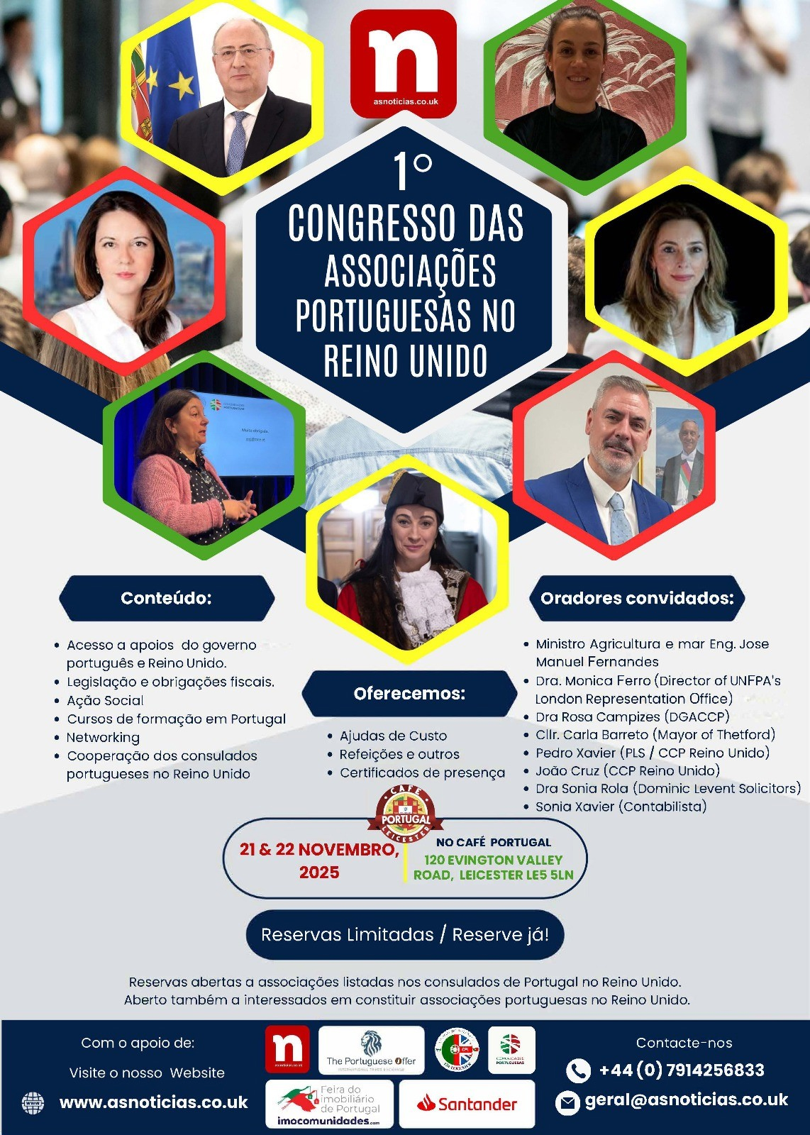 Organizado pelo jornal AAA, o 1.º Congresso das Associações Portuguesas no Reino Unido realizar-se-á no próximo sábado, dia 22 de novembro, no Salão de Festas do Café Portugal, na cidade inglesa de Leicester, e será um dia inteiramente dedicado ao intercâmbio de conhecimento, partilha de experiências e reforço das condições que permitem às associações portuguesas manter e ampliar o seu trabalho junto das comunidades.