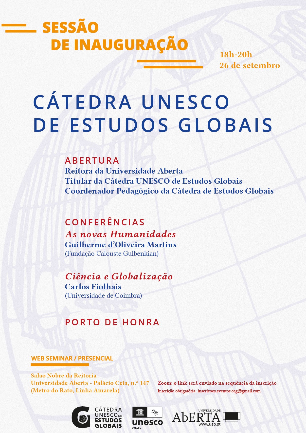 Está marcada para dia 26 de setembro, pelas 18h, a sessão solene de apresentação pública da Cátedra UNESCO de Estudos Globais no Salão Nobre (Palácio Ceia) da Universidade Aberta, em Lisboa, Portugal. O evento terá como oradores convidados Guilherme d’Oliveira Martins, administrador da Fundação Calouste Gulbenkian, e Carlos Fiolhais, professor catedrático da Universidade de Coimbra.